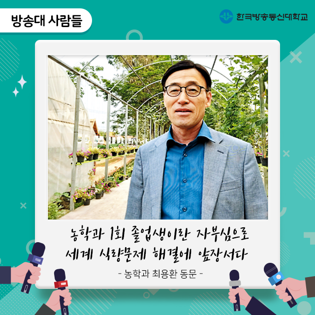 최용환 동문은 방송대 농학과 1회 졸업생입니다. 그가 방송대를 졸업하고 서울대 대학원 농학과에 진학할 수 있었던 것은 버스에서 우연히 만난 허문회 교수님 권유 덕분입니다. 가난한 집 6남매 중 넷째로 태어난 그는 대학에 진학할 꿈도 꾸지 못했습니다. 그저 시간이 날때마다 그저 자신의 형과 인구에 비해 재배면적이 협소한 우리나라의 식량문제에 대해 의견을 나누는 것이 ‘지적 대화’의 전부였습니다. 그러던 중 고등학교 졸업 후, 친척 형이 운영하는 공장에서 일을 하다가 라디오에서 방송통신대학교에 대한 얘기를 듣게 됐습니다.