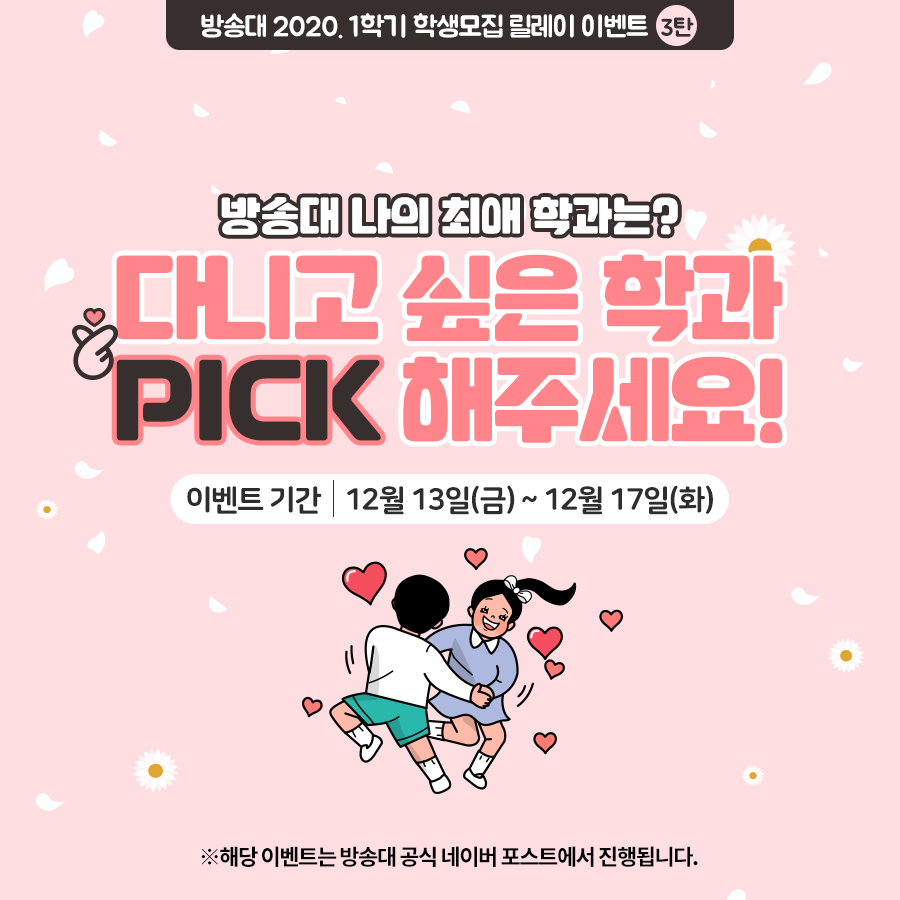 | [이벤트] 방송대 2020.1학기 학생모집 릴레이 이벤트 4탄_반할 수밖에 없는 방송대의 매력POINT는? (0) | 2019.12.23 |