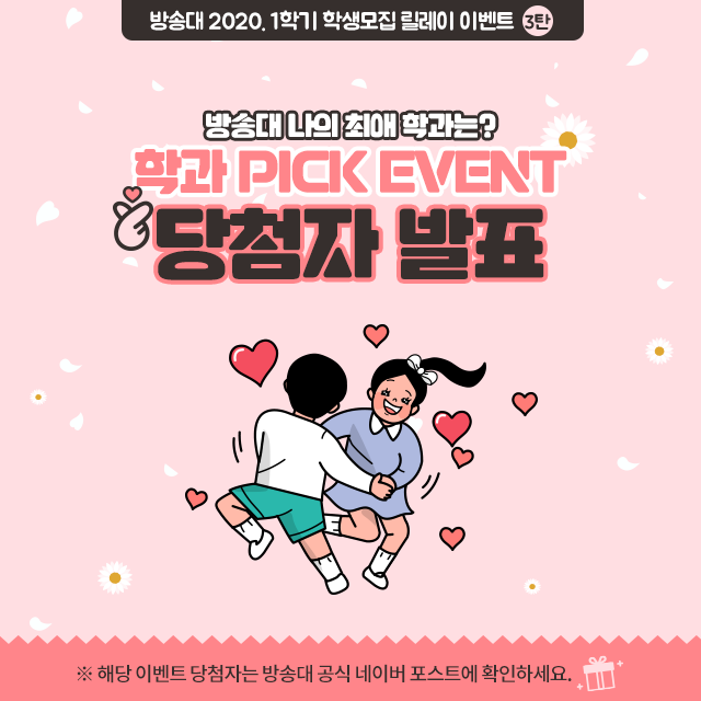 | [이벤트] 방송대 2020.1학기 학생모집 릴레이 이벤트 3탄_네이버포스트 최애학과 PICK 이벤트 (0) | 2019.12.13 |